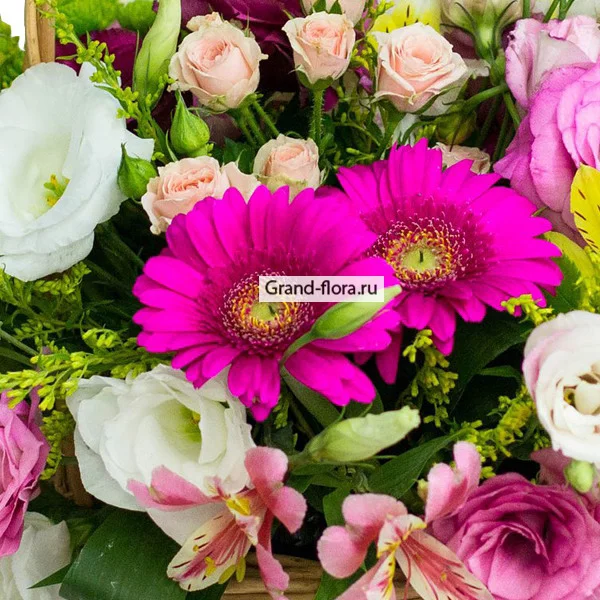 Данная корзина создает впечатление  будто вы летним, солнечным утром, прогуливаясь по полям, собрали  букет свежих цветов, что бы покорить этот мир и удивить человека, которому предназначенно это цветочное чудо.Яркая  и контрастная композиция в корзине,  выполненная  из свежих разнообразных цветов, сделает неожиданный подарок приятным и будет радовать глаз еще долгое время.
