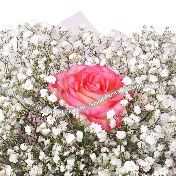 Букет выполнен из воздушной белой гипсофилы и розовой розы сорта Аква, обернутый в фетр в тон розе. Размер букета от 20см в диаметре, до 30 см в диаметре, в зависимости от выбранного Вами варианта букета. Обращаем Ваше внимание, что состав и оформление букета могут отличаться.
