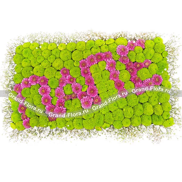 Стандартный: хризантема кустовая зеленая (сантини) - 20 шт, хризантема кустовая фиолетовая - 8 шт, гипсофила - 5 шт, оазис.
