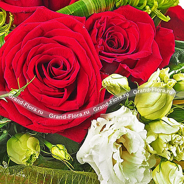 ДЕЛЮКС: роза красная - 19 шт, хризантема одноголовая зеленая - 12 шт, эустома белая - 10 шт, лист аспидистры загнутый - 8 шт, сетка зеленая. Примерный размер: 45Х45 см.