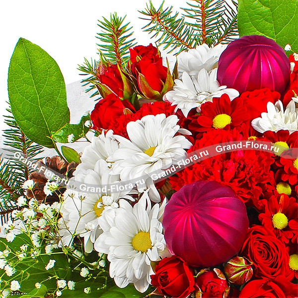 Стандартный (на фото): хризантема красная кустовая - 3шт., хризантема белая кустовая - 3шт., гвоздика красная - 3шт., роза красная кустовая - 2шт., гипсофила - 2шт., еловая ветвь, новогодний декор и зелень, фетр белый.
