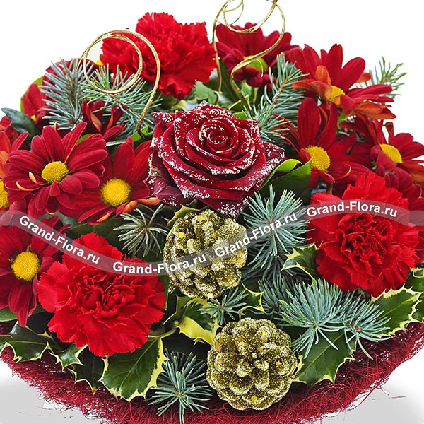 Стандартный: Роза красная - 3 шт., хризантема кустовая красная - 2 шт., гвоздика красная - 3 шт., салал - 2 шт., еловая ветвь - 3 шт., шишки декоративные (маленькие)- 2 шт., сизаль красный (упаковка), красная лента.