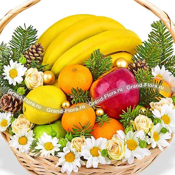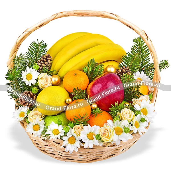 Уменьшенный: Бананы - 0,5 кг, мандарины - 0,5 кг, яблоки зеленые - 2 шт, яблоки красные - 1 шт, лимон - 1 шт, хризантема кустовая ромашковая - 1 шт, роза кустовая белая - 1 шт, шишки - 2 шт, хвоя, шары новогодние "золотые" небольшие - 3 шт, оазис, корзина средняя.