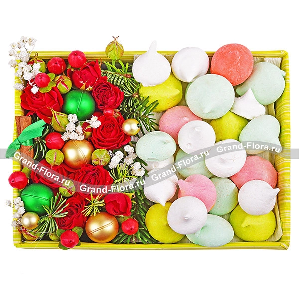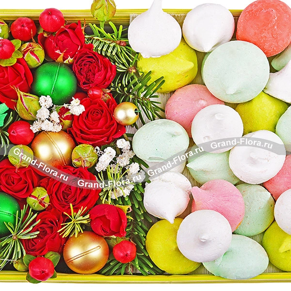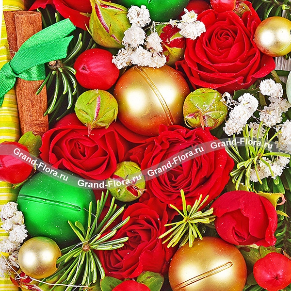 Стандартный: роза кустовая красная - 2 шт., ель - 1 шт., ёлочные игрушки - 4 шт., гипсофила - 1 шт., палочки корицы - 1 шт., безе, оазис, коробка.