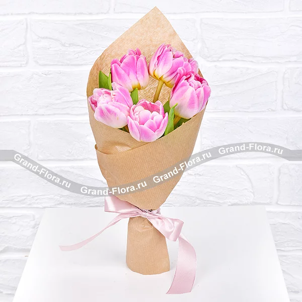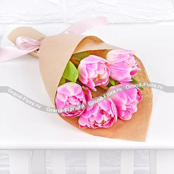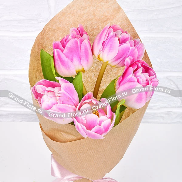 5 тюльпанов: тюльпан розовый - 5 шт., упаковка крафт, лента.