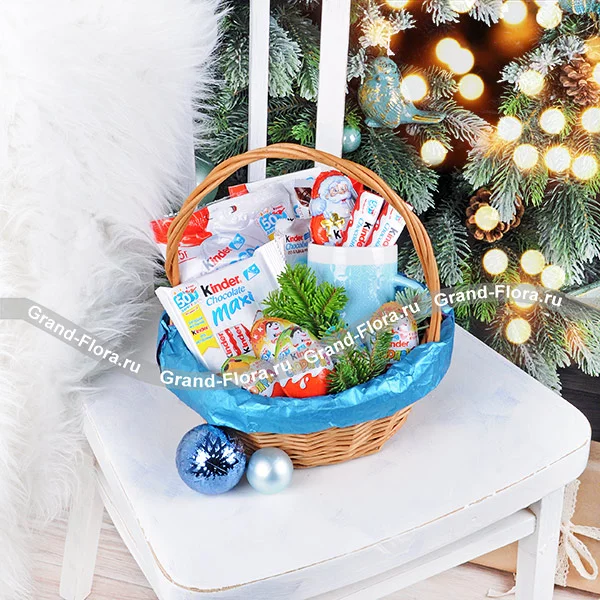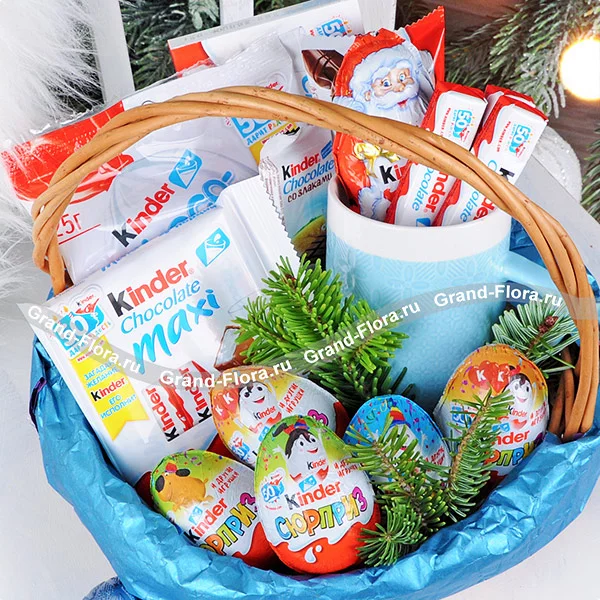 Стандартный: киндер "Maxi" - 84 г., киндер "Choco-Bons" - 125 г., киндер "Bueno" - 43 г., киндер "Сюрприз" - 4 шт., киндер "Дед Мороз" - 110 г., киндер "chocolate maxi" - 2 шт., киндер со злаками - 23,5 г., кружка - 1 шт., ель, декор, корзина малая.
