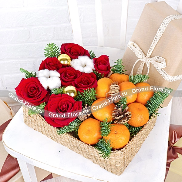 Стандартный: роза красная - 7 шт., хлопок - 2 шт., шарики - 2 шт., ель, мандарины - 1 кг., шишка - 1 шт., корица - 1 шт., оазис, корзина.