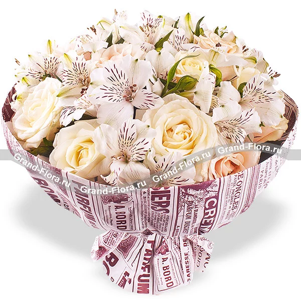 Роскошное сочетание кремовых роз и альстромерий станет великолепным цветочным подарком к любому торжеству!